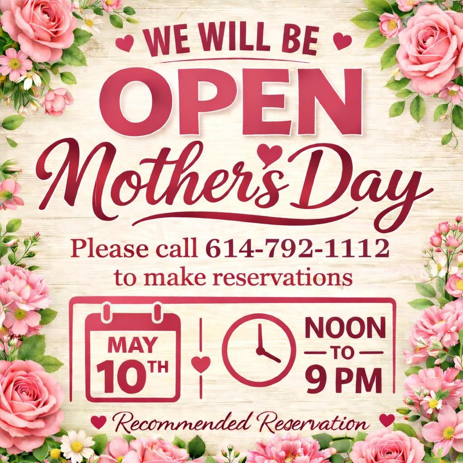 Join us on Mother's Day and treat your mom to a delicious meal! Open from Noon - 9PM